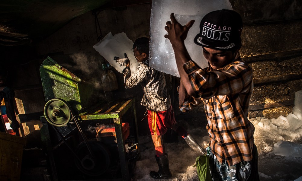 Uomini piccoli e magri scaricano dai camion grandi blocchi di ghiaccio e li trasportano su carretti sgangherati. I primi raggi del sole sollevano nuvole di vapore. Macchine assordanti tritano i blocchi in continuazione.